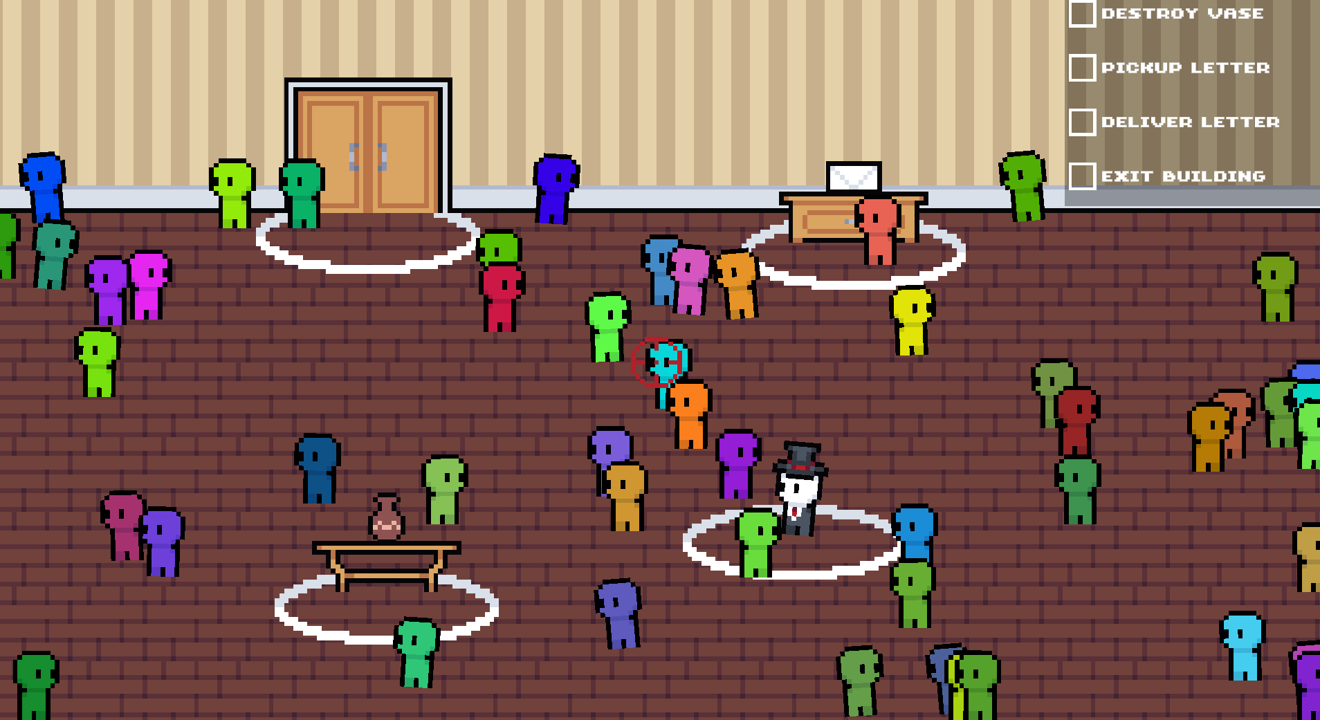 The player must find themselves and then complete there tasks while avoiding being spotted by the sniper. The sniper needs to find the player and snipe them out of a crowd of people. Try not to hit an innocent person!